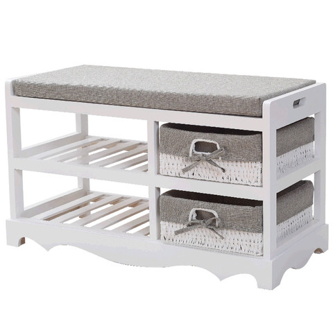 Scarpiera bianca in legno a 2 livelli scarpiera scarpiera scarpiera con sedile imbottito e 2 cestini di vimini di stoccaggio