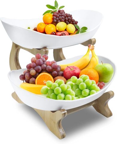 과일 케이크 캔디를위한 천연 대나무 스탠드가있는 2 계층 흰색 플라스틱 과일 디스플레이 스탠드