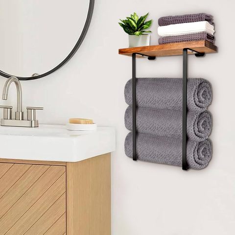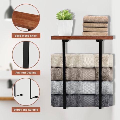 Banyo duvar için havlu rafları, küçük banyo organizatör dekor için havlu depolama için ahşap raf ile Metal havlu tutucu